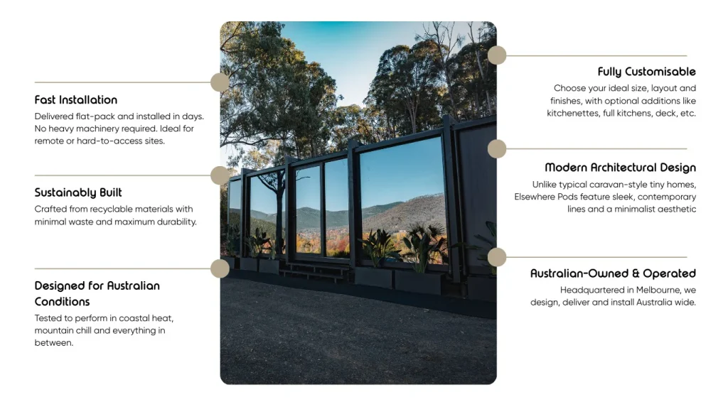 Their pods aren’t an afterthought. Every pod is engineered to meet the National Construction Code and Australian Standards, with floor-to-ceiling thermally broken double-glazed windows, high-performance insulation, and a lightweight structural aluminium frame. Elsewhere Pods These are dwellings built to last, built to perform, and built to look stunning doing it.