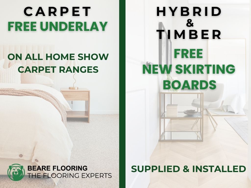 Beare Flooring – The Flooring Experts – are proud to offer Home Show visitors unbeatable value across our Home Show ranges. Experience our 5-star service and take advantage of these exclusive Home Show offers: • FREE NEW Skirting Boards supplied & installed on all Home Show Hybrid & Timber flooring ranges • FREE Skim Coat on all Home Show Vinyl Plank ranges • FREE UNDERLAY on all Home Show Carpet ranges Visit the Beare Flooring stand to meet our friendly team, experience our 5-star service and products, and discover why more homeowners are choosing Beare for their flooring needs.