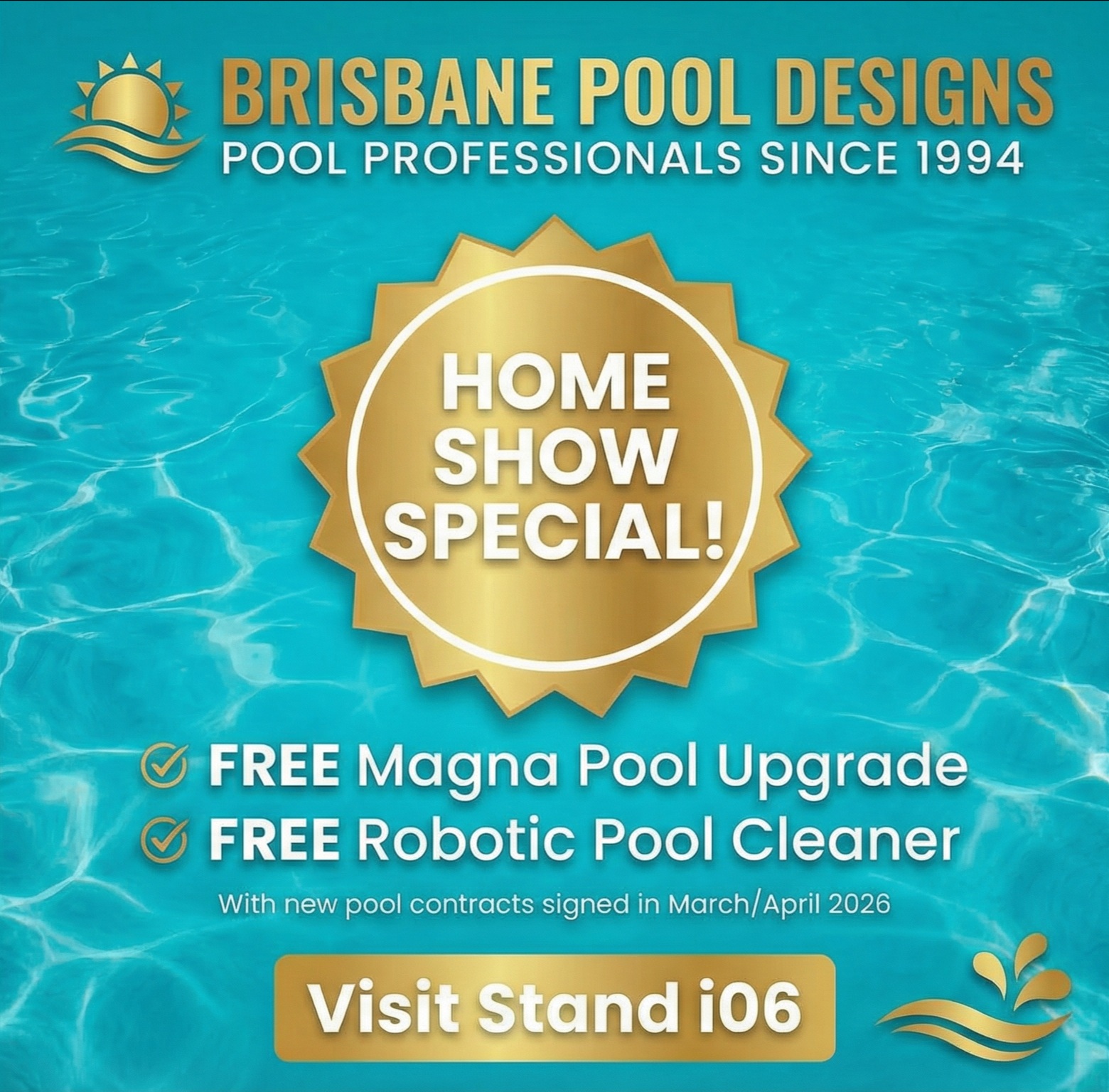Come see us at Stand i06 and get a FREE Magna Pool Upgrade AND a FREE Robotic Pool Cleaner included with your pool purchase when you sign your new pool contract in March or April 2026