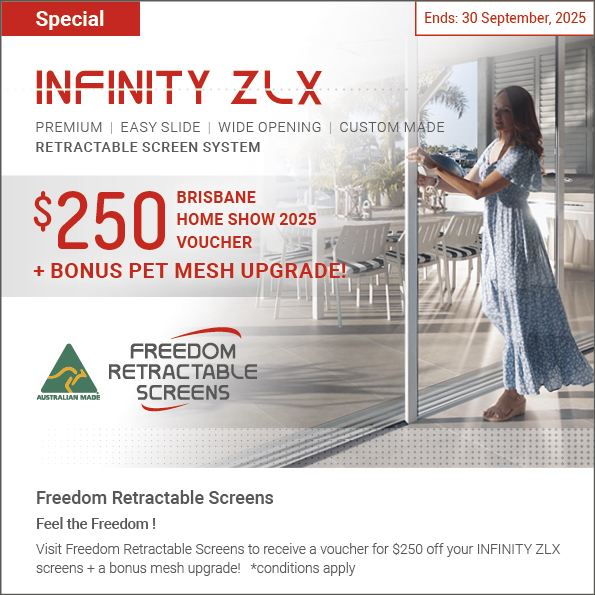 View ExhibitorVisit Freedom Retractable Screens to receive a voucher for $250 off your INFINITY ZLX screens + a bonus mesh upgrade!