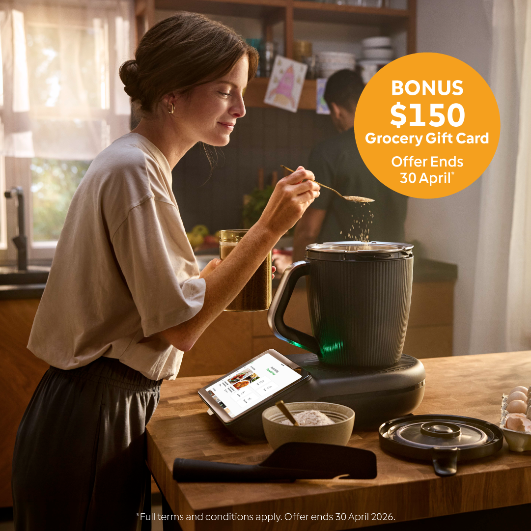With your TM7 and Cookidoo®, dinner’s sorted every night. Purchase your TM7 in April and get a $150 grocery e-gift card to fill your fridge and get started.